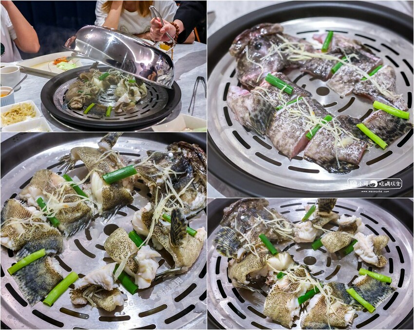 龍虎斑切塊,以蔥段和薑絲提味,直接用蒸氣鍋料理蒸熟。