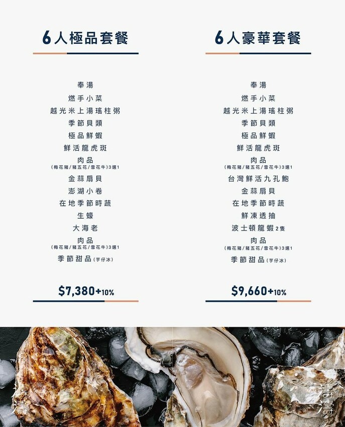 菜單以套餐方式供應,有2人、4人、6人、8人和10人套餐,食材也都可以單點,食材皆為在地小農蔬菜、海鮮等最新鮮的原型食物,可以吃到原汁原味的鮮甜,並提供專人桌邊服務,用餐另收10%服務費。