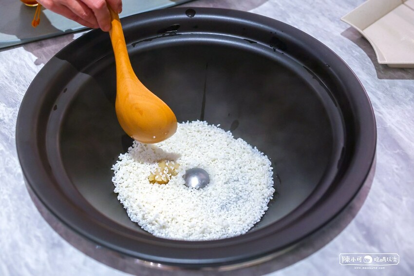 服務人員先在蒸氣鍋底層放入日本越光米,接著加入老母雞、金華火腿熬煮而成的上湯,讓海鮮和各種新鮮食材在蒸煮過程中,透過蒸氣加熱,讓食材本身的鮮甜慢慢滴入粥裡,吃完海陸後品粥,有點像是火鍋常吃到的雜炊,但濤濤的吃法更健康,都是注入食材的原汁風味。