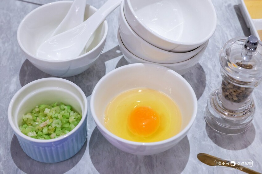服務人員桌邊服務,依序打入蛋花攪拌,並加入芹菜讓味道更完美。