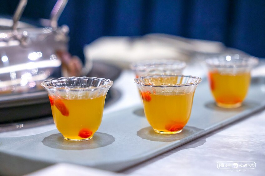 開場白的“奉湯”特顯出餐廳的用心和特別,朋友還誤以為是茶湯,以老母雞、金華火腿熬煮而成的上湯,加入枸杞增加鮮甜,充滿鹹香還有雞骨的甜味,甘甜可口。