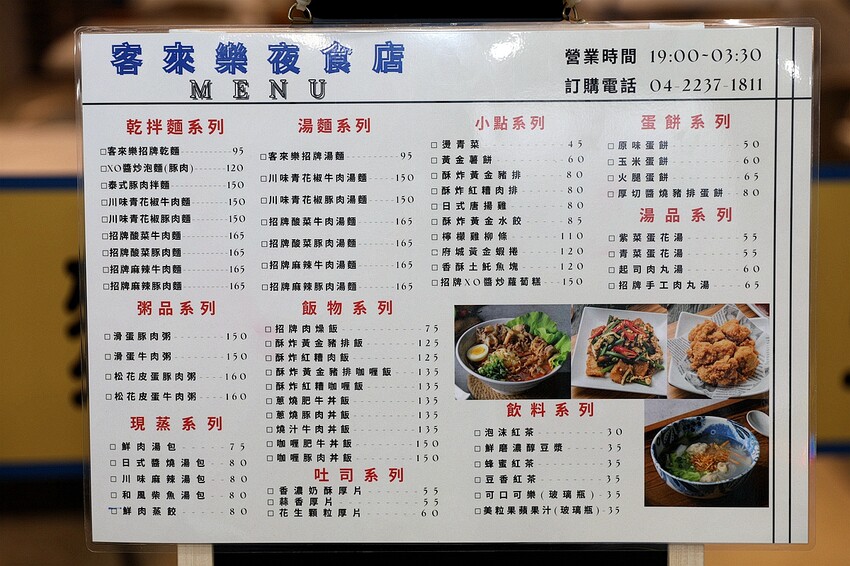 文章內有客來樂夜食店地址、電話、營業時間、完整菜單價目表menu可提供參考