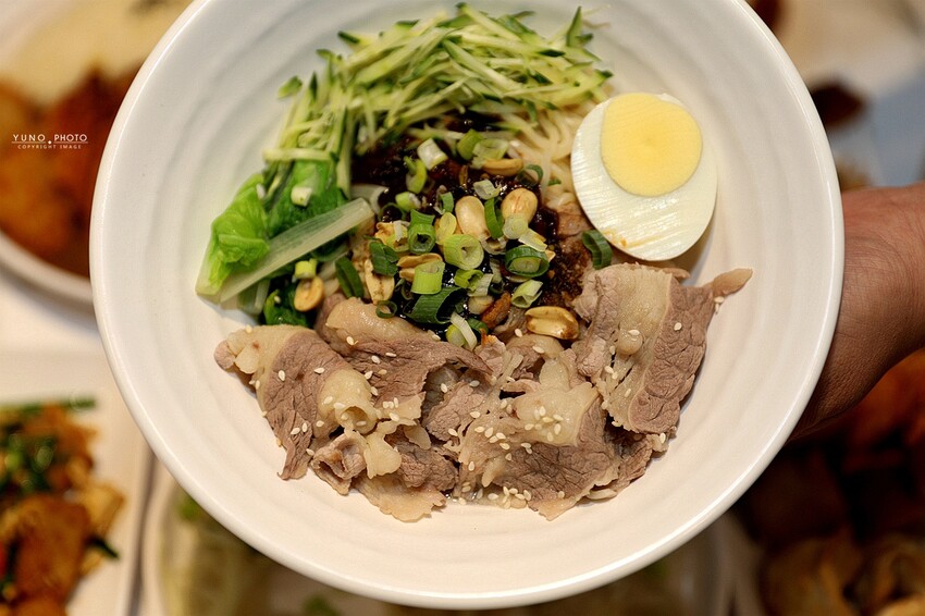 麵條上舖著燙過的牛五花肉、水煮蛋、小黃瓜絲及花生米
