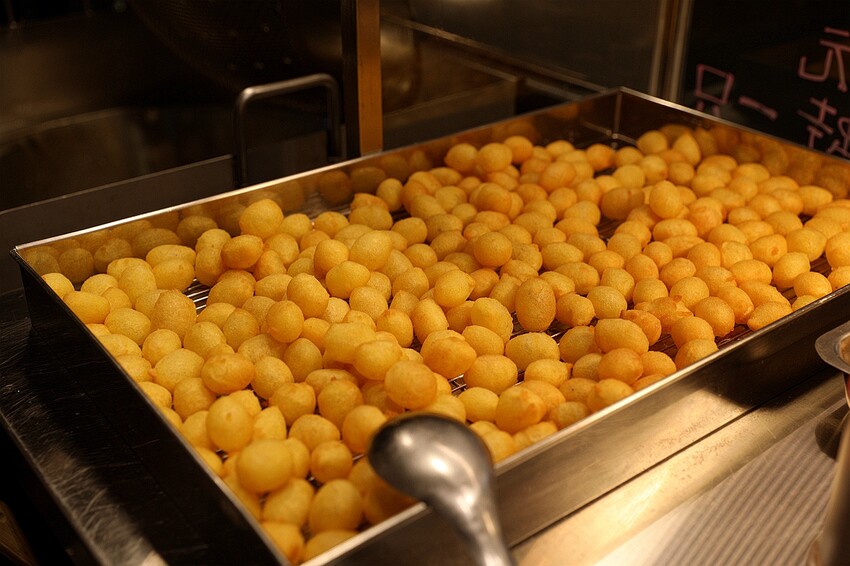 地瓜球經過擠壓與攪拌 炸到呈現金黃色澤一顆顆小小的好療癒