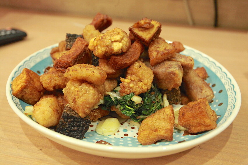 小高今天點鹹酥雞、米血、甜不辣、芋頭塊、豆干、魚板、魷魚.....等等約200左右,外加一塊炸雞排70元。