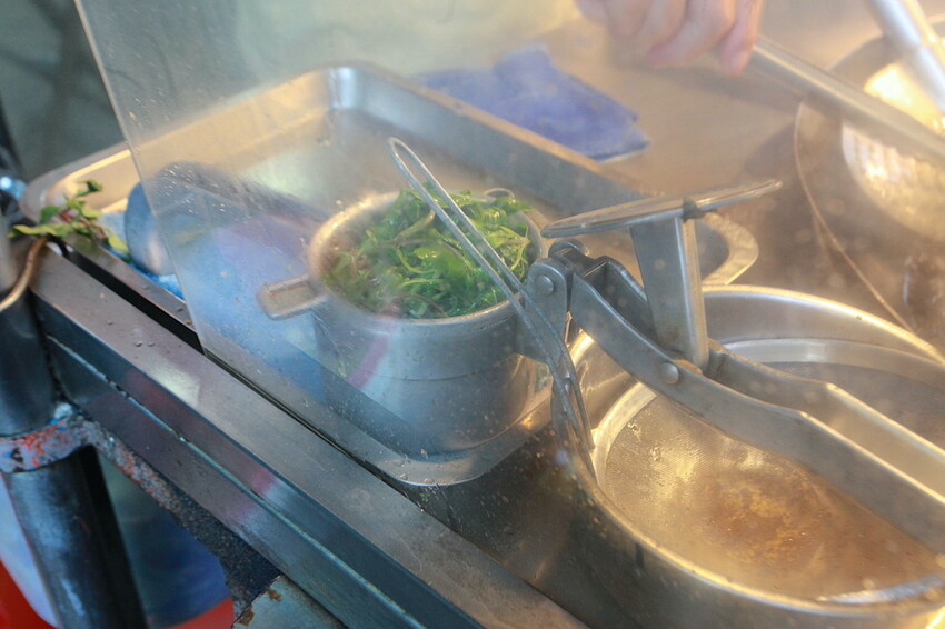 老闆會把九層塔油漬分批擠壓出來,當您油炸食材時會擠一些油在油鍋裡,這樣子來產生鹹酥雞九層塔香氣。