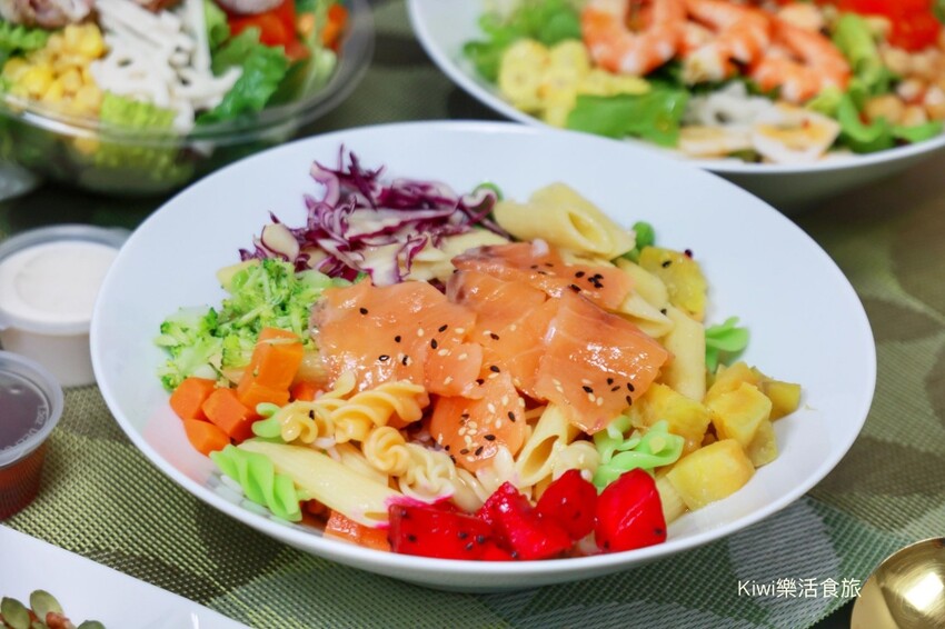 先來分享我的煙燻鮭魚,每份餐點都是相同重量因此不用擔心攝取的食物過量,繽紛的色彩正是夏威夷輕食餐盒的特色之一,Kiwi選擇花椰菜、地瓜、紫高麗菜、胡蘿蔔、火龍果、毛豆,在搭配香檸橄欖油無敵清爽~
