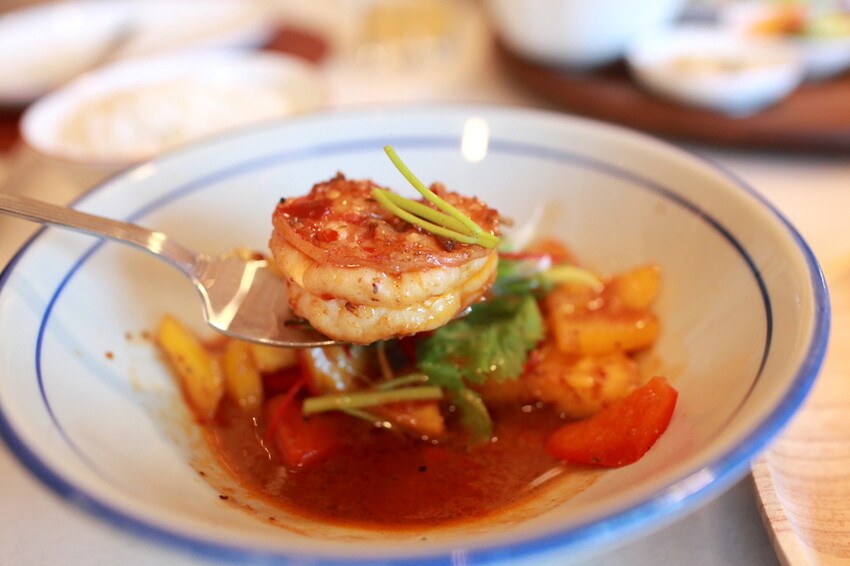 參峇烤虎蝦顧名思義就是使用參峇醬來料理,使用青椒、紅椒、香菜...等來搭配。