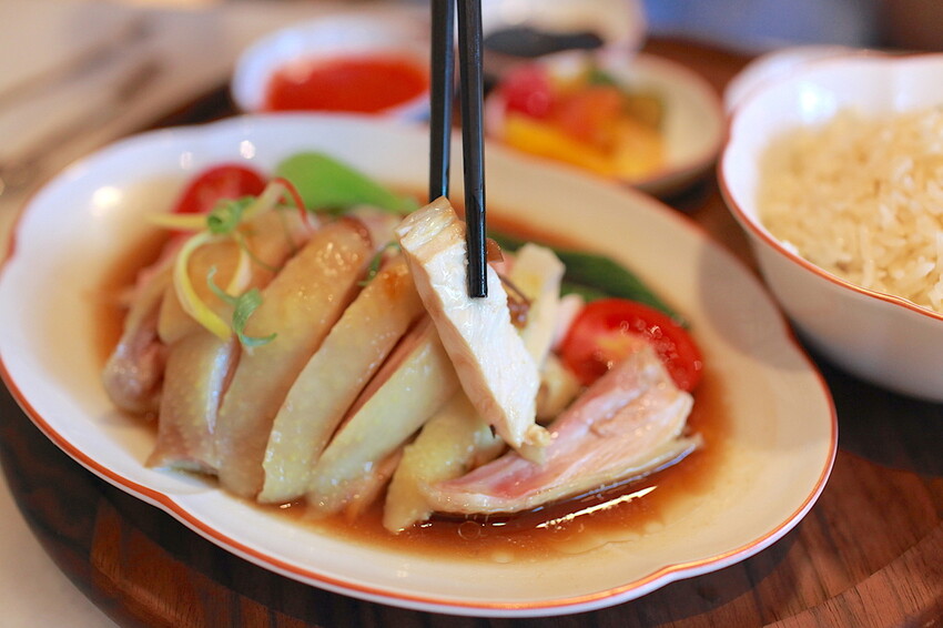 海南雞飯以白切仿土雞配上油雞飯與雞湯,售價480元。