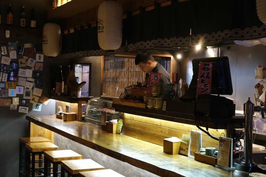 ▼【鳥重地雞燒バーベキュ】店內小巧精緻,分為室內和戶外的空間,約可容納18~22人左右,以暖色系燈光搭配日式吧檯座位,營造出溫馨居酒屋的氛圍。