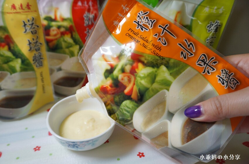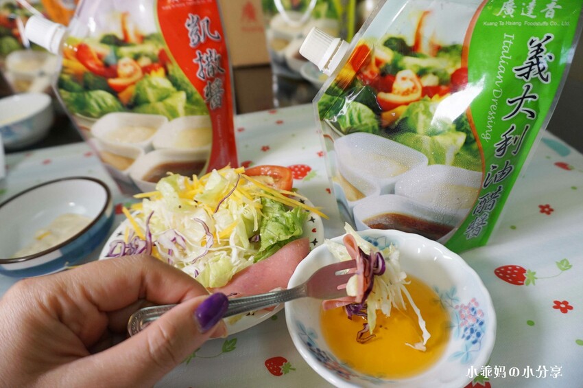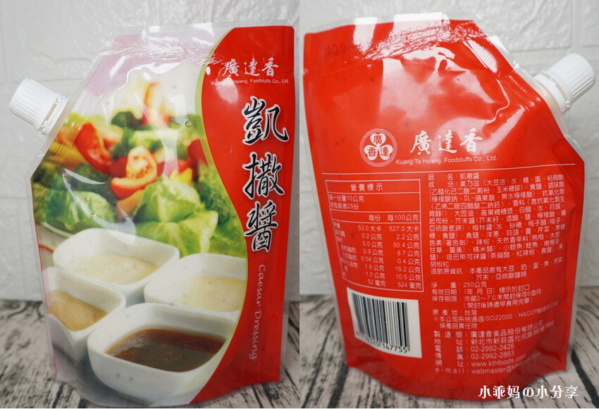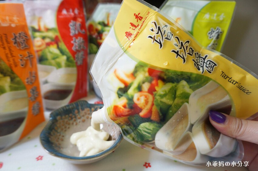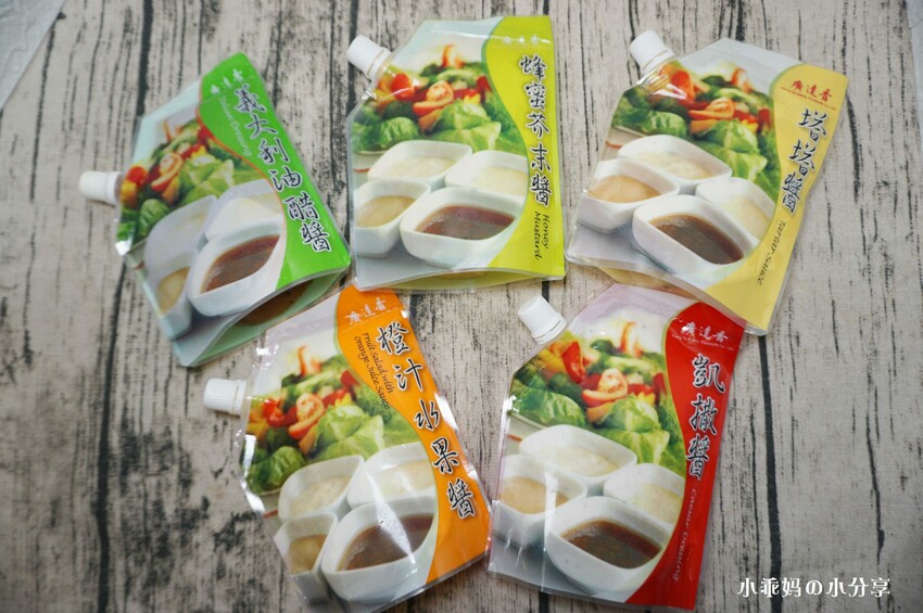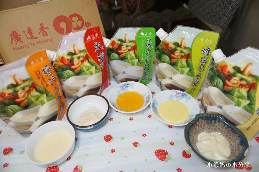 這次小乖媽跟大家介紹廣達香有五種沙拉醬:凱撒醬、蜂蜜芥末醬、義大利油醋、橙汁水果醬、塔塔醬