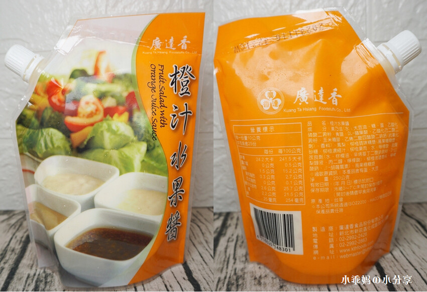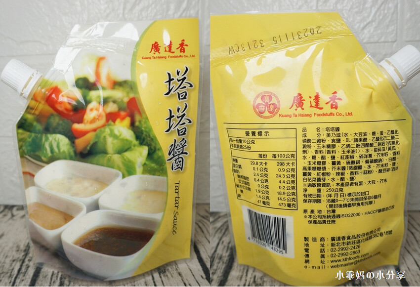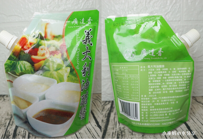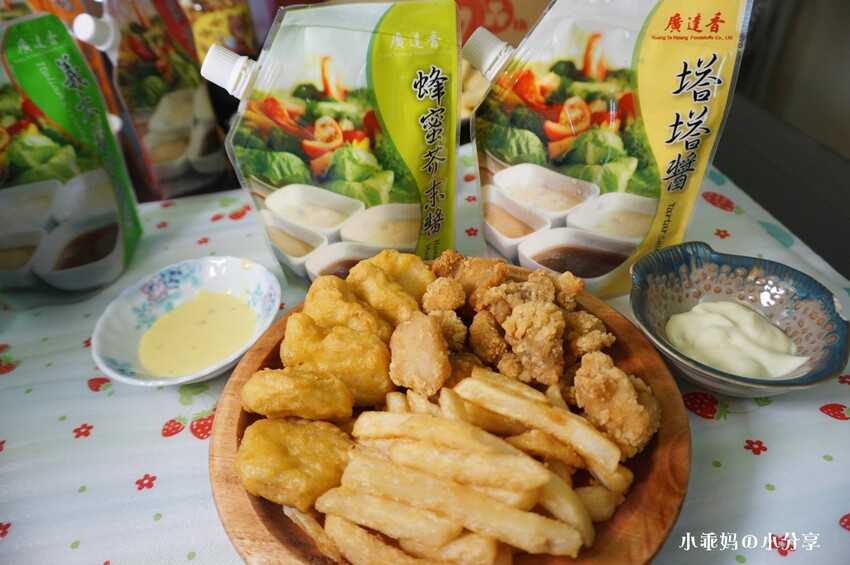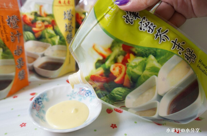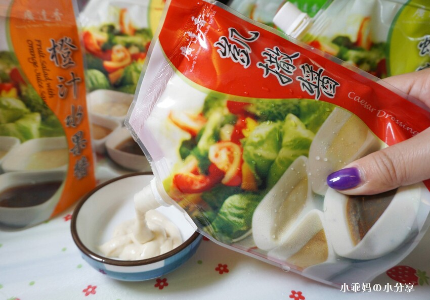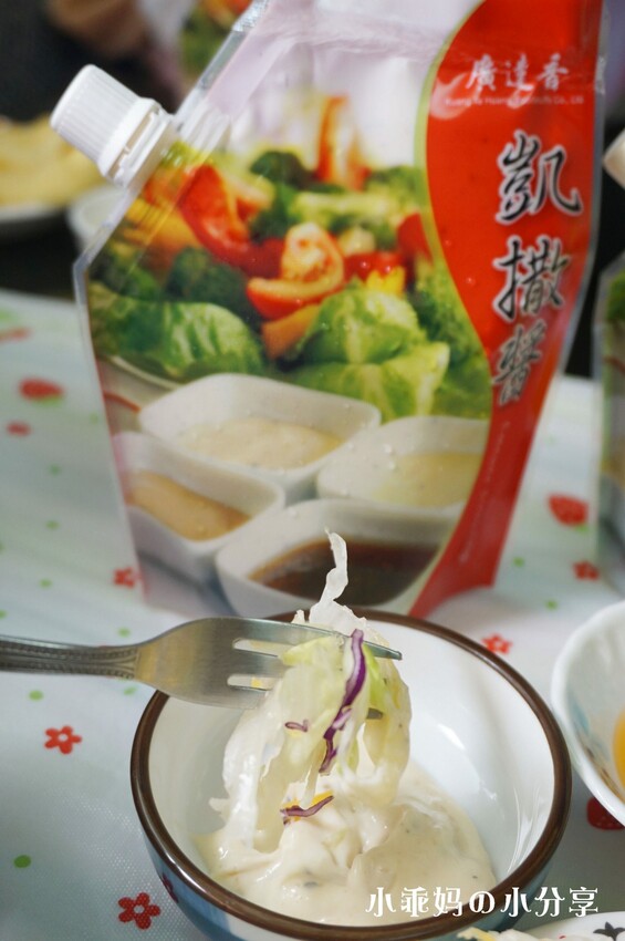 這次小乖媽跟大家介紹廣達香有五種沙拉醬:凱撒醬、蜂蜜芥末醬、義大利油醋、橙汁水果醬、塔塔醬