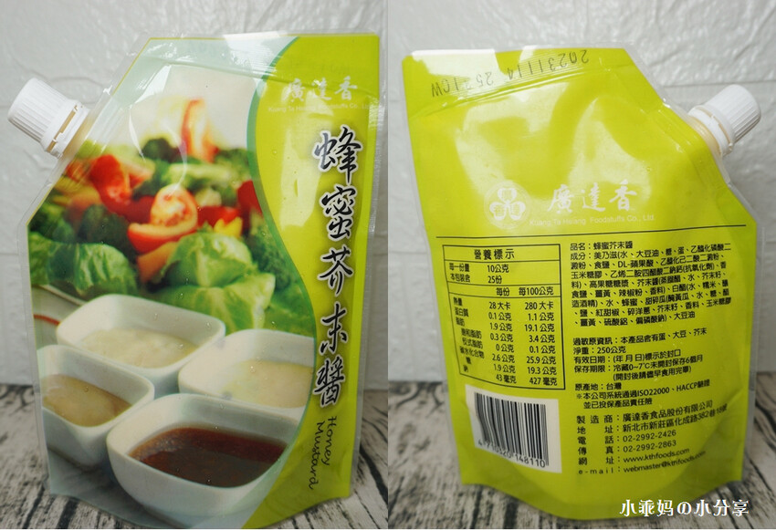 蜂蜜芥末醬跟我想像的芥末醬完全不一樣耶,廣達香的蜂蜜芥末醬口感是酸甜的,不嗆辣耶,原來是用天然的蜂蜜增加香氣,不但可以當沾炸物吃,也可以沾水果吃哦,非常對味,大人小孩都愛~超級百變的醬料!!!