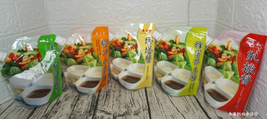 凱撒醬、塔塔醬、蜂蜜芥末醬、橙汁水果醬、義大利油醋醬等多種口味可以選擇,滿足全家人的口味,這些醬料可以搭配水果、生菜沙拉、炸物、海鮮、餅乾、等等~~~一樣的食物搭配不同的醬料,變化出多重的風味!!!酸甜滋味不但讓胃口大開,吃了心情也會變好喔~~~