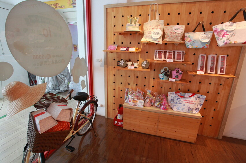 玻璃櫥窗有擺放淑女腳踏車有點小清新,牆面有一些周邊商品供客人選購。