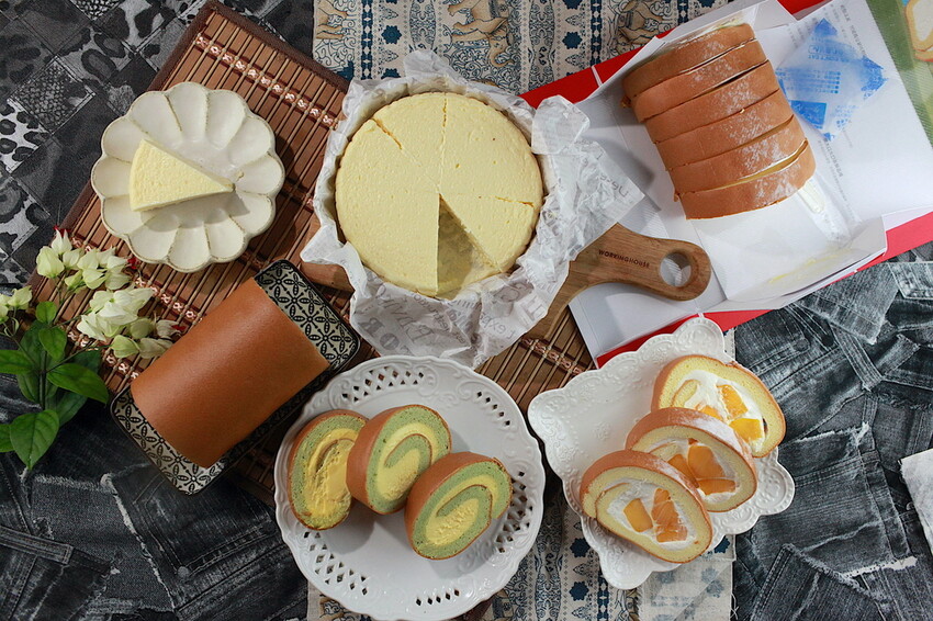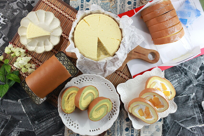 桌面上有水蒸巴斯克、新鮮芒果生乳捲及法式青桔芒果生乳捲等,切這個蛋糕及生乳捲有個小訣竅,把刀子泡在溫熱水裡提高刀子溫度,就可切出美美生乳捲和蛋糕橫切面,能可以試試看能享用甜點美味之餘,能拍張美照上傳與網友分享。