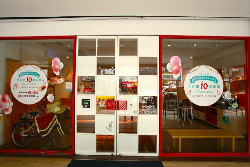 大片落地窗隱約可直視裡面溫馨氣氛,大門使用馬克磚視覺來呈現意境,玻璃櫥窗有貼上10週年優惠供參考,當然更多優惠敬請觀看文末的資訊。