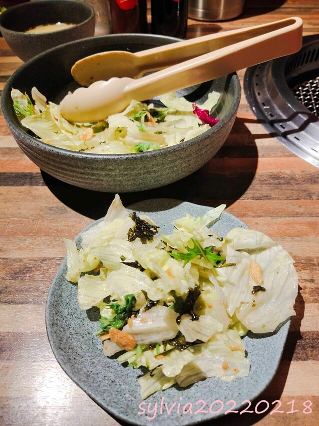 ▼桌面有鹽、味噌醬、水果醬(燒肉醬)長型木盤裝的是套餐附的:燒肉漬物六小福,可以搭配肉一起吃。 有特別喜歡的其中一種需要用加購的,我看菜單一碟$10。