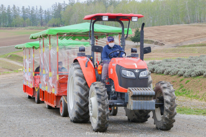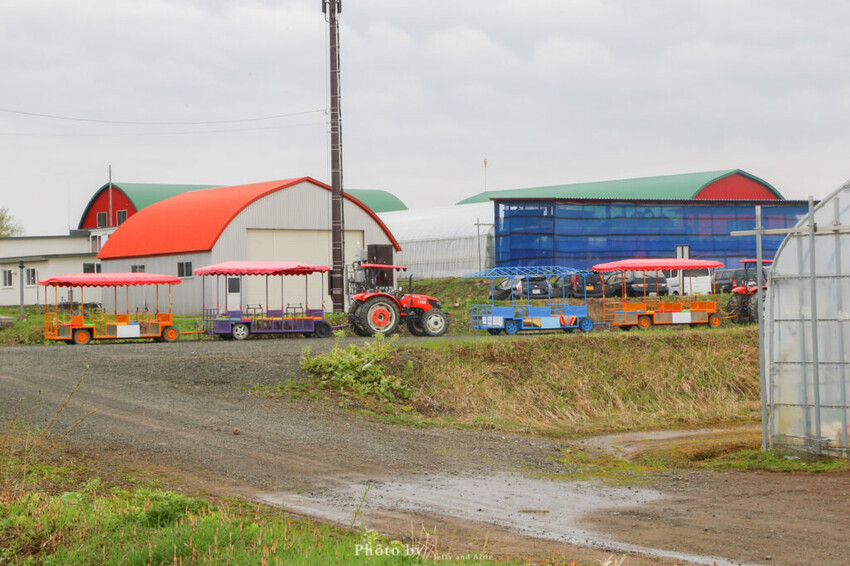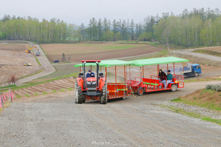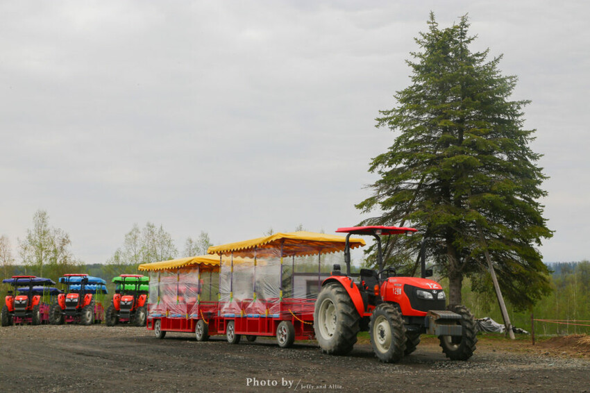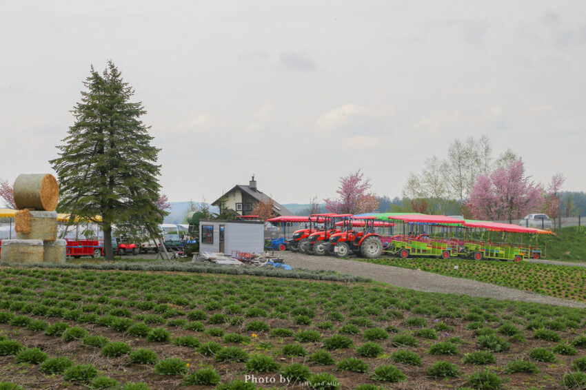 四季彩之丘園區還蠻大的,不想走路的話,也可以乘坐園區裡的拖拉機巴士,穿梭在花田裡面,途中也會停車一次作為拍照時間。不過因為五月花都還沒開,我們也就沒有坐囉!