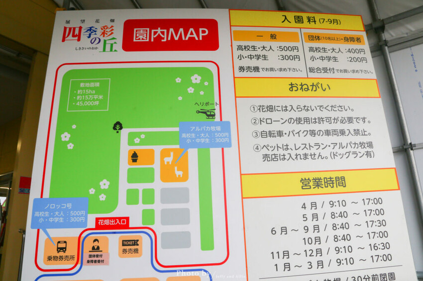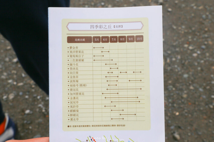 外面有停車場,入園後拿到一份四季彩之丘的花曆,六、七、八月重覆最多花期,也是最多觀光客的時候。到了10月之後就沒有花季了,冬季會變成一片雪原,能夠駕駛雪地摩托車。📢查看官網最新花況