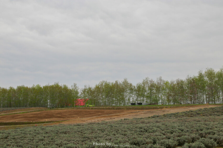 四季彩之丘面積達15公頃,非常廣闊,向外望能看到一片空曠的土地,這些到了夏天會變成不同顏色的花田,拼織成漂亮的風景,現在五月初什麼都看不到。春天的北海道還是很冷,這裡的風大,當天天氣灰濛濛的,沒有拍到好看的照片,有點可惜啊。