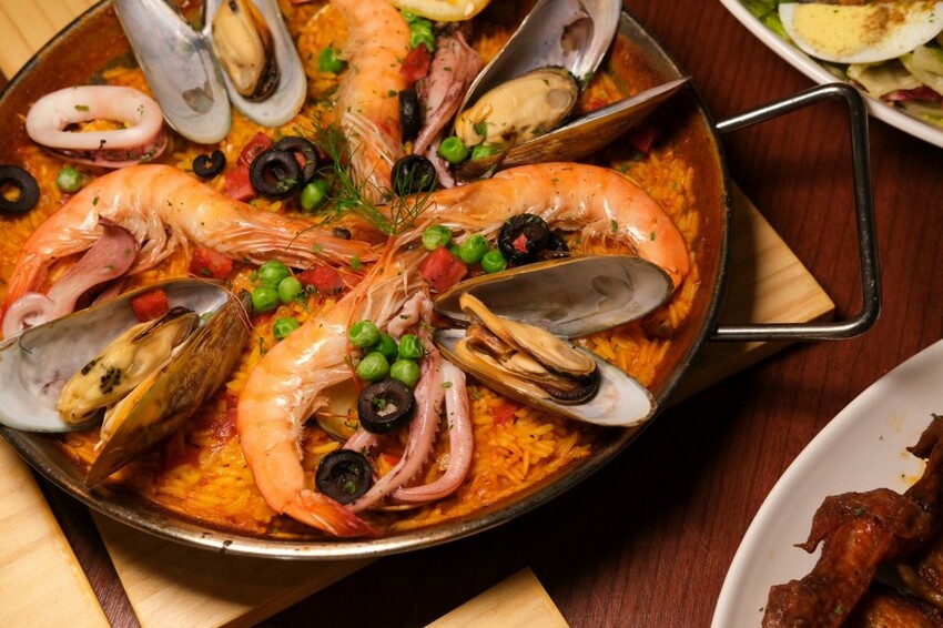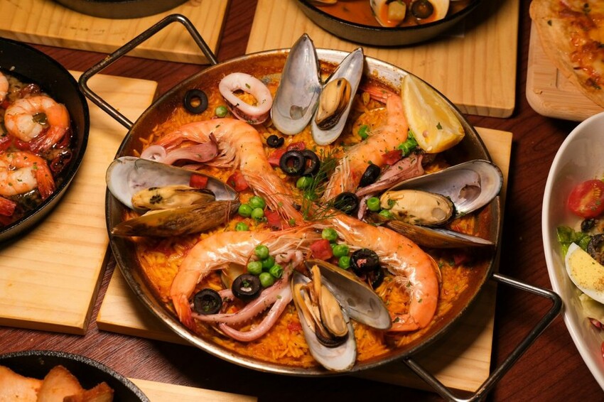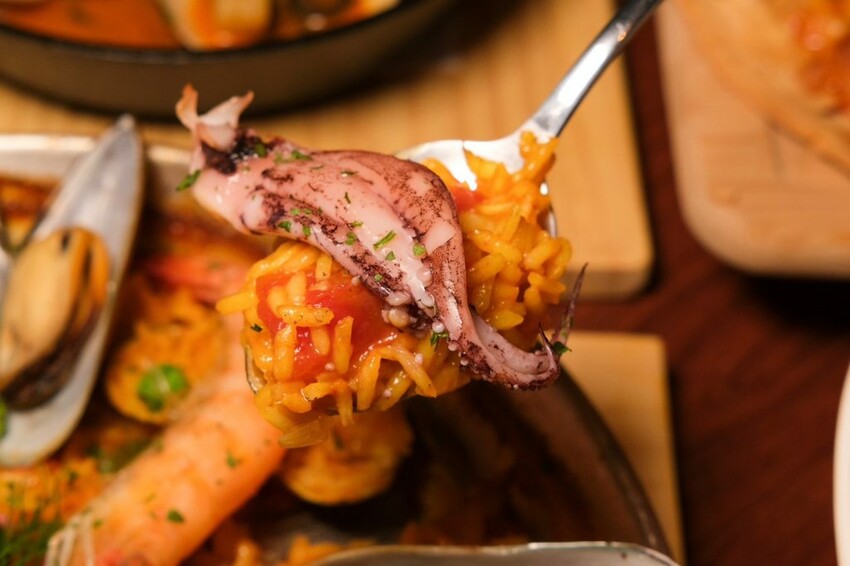 ▼用料豐盛的經典西班牙海鮮飯,以海鮮高湯及番茄熬煮飯,保留了米心的口感,吃起來是很正統的偏硬路線,搭配淡菜、草蝦、花枝和蛤蜊,每一口吃起來都充滿鮮味。