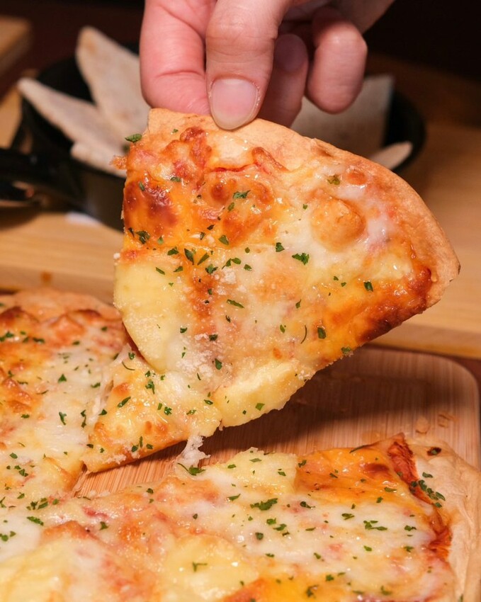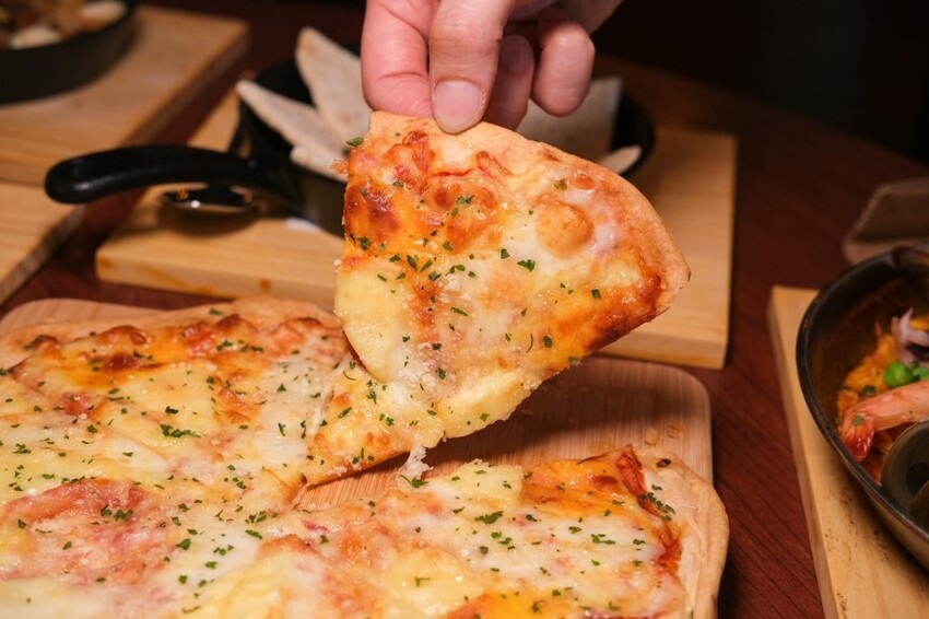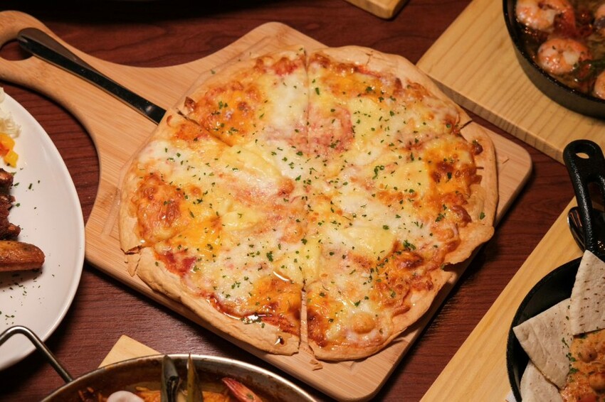 ▼上桌就被秒殺的四種起司披薩,放入切達起司、莫札瑞拉起司等四種起司,頂頭再淋上香甜的蜂蜜點綴,起司與蜂蜜完美交織,同時帶有番茄的微酸更耐吃,以手桿的薄餅皮咬起來軟Q帶勁,趁熱享用還會以牽絲效果!