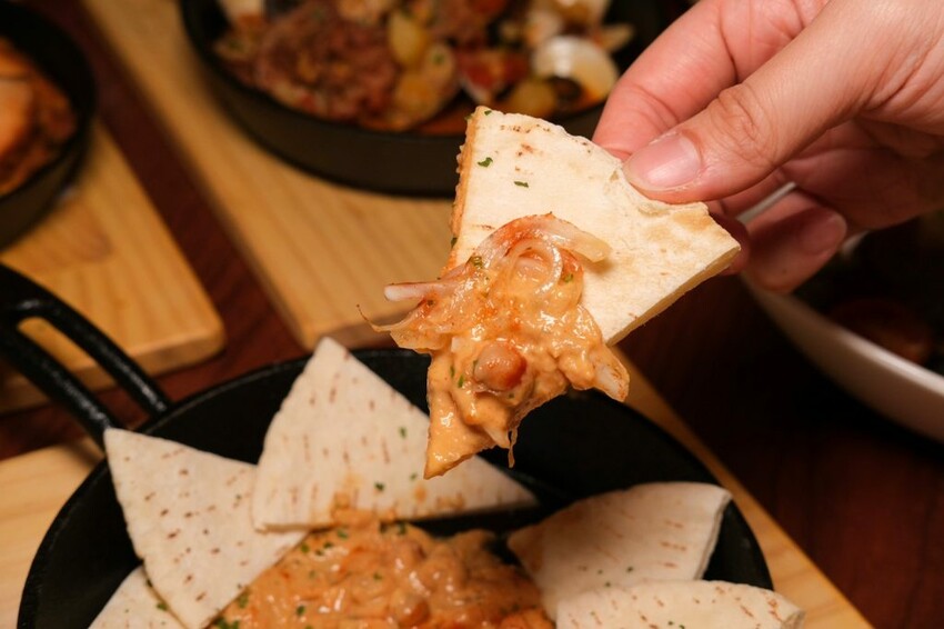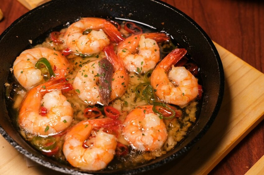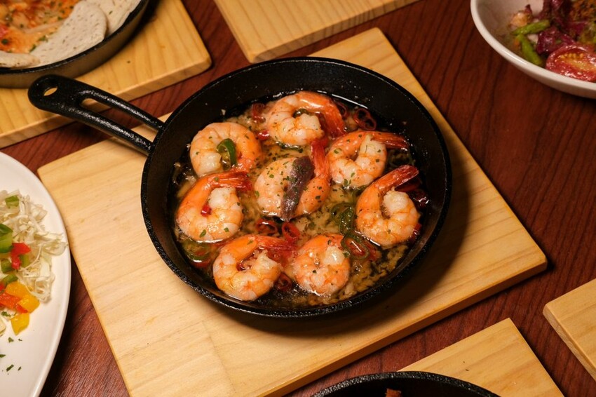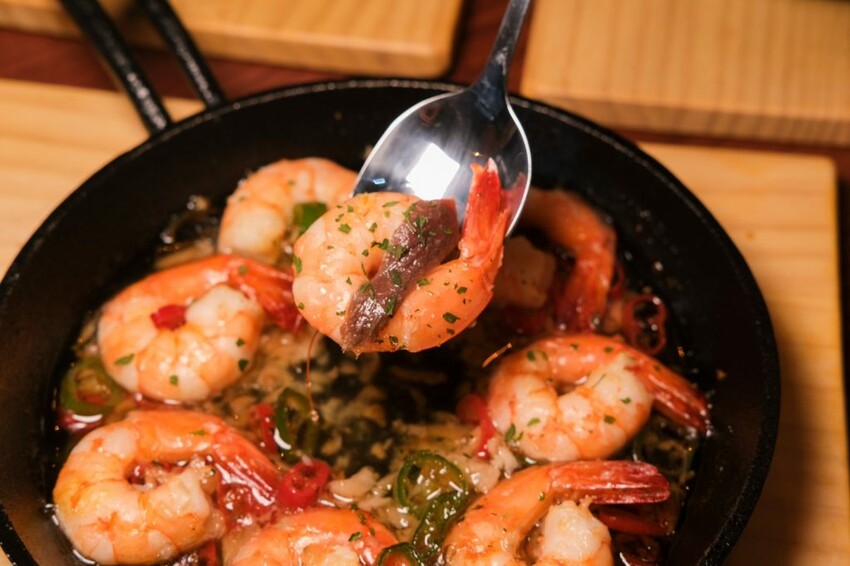 ▼西班牙傳統的鯷魚辣炒蝦,蝦肉吸附了滿滿的精華,口感彈牙鮮美,除了使用的蒜頭、辣椒、橄欖油之外,再加入鯷魚帶出蝦子更多的鮮甜美味。