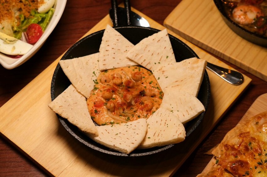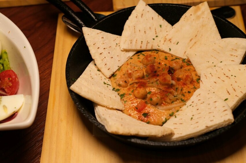▼起源於埃及的鷹嘴豆泥佐批塔,在鷹嘴豆泥中加入芝麻醬、橄欖油、檸檬汁和大蒜,口感綿密細緻,搭配Pita批塔麵包享用口感很豐富。