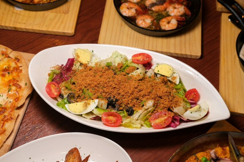 四人套餐包含開胃菜、沙拉、西班牙燉飯、披薩、炸物、下酒菜(兩道)、副食,共有八道菜色可任意挑選。