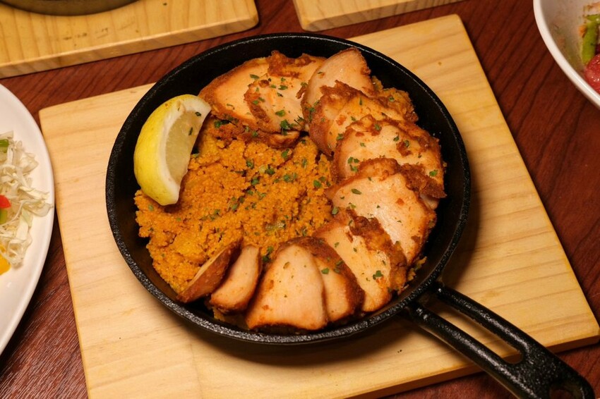 ▼來自北非的摩洛哥式烤雞小米,是北非摩爾人與柏柏人的主食,以義大利麵原料杜蘭小麥粉製成的小米,搭配多款香料及香菜炒出迷人的香氣,最後放上慢火烘烤的軟嫩雞胸肉,吃起來充滿特色的異國風味~