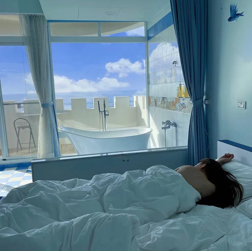 慢點海景民宿有著米白色的外牆,門前還種著幾棵椰子樹,頗有東南亞異國風情,民宿正門口隔條馬路便是太平洋,不只從房裡便能眺望無垠的海景,從浴室裡也能看到美麗的大海,讓你邊泡澡邊看海。隔天不妨設個鬧鐘早點起床,躺在床上透過落地窗欣賞美麗的日出,自海的那一頭緩緩升起,展開美好又悠閒的旅程。