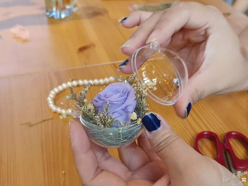 把永生花放在中間,周邊再放點綴性質的花材就好了