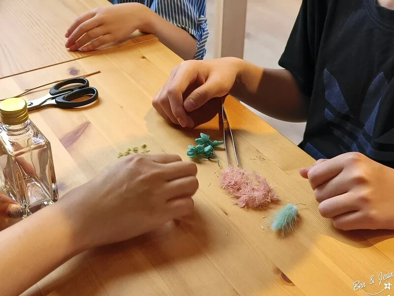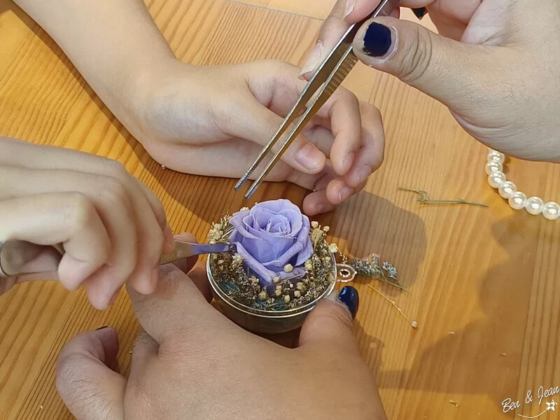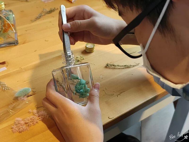 在服務人員的解說下,先將想置入瓶中的花飾挑出來,然後先在腦海中構思想呈現的畫面