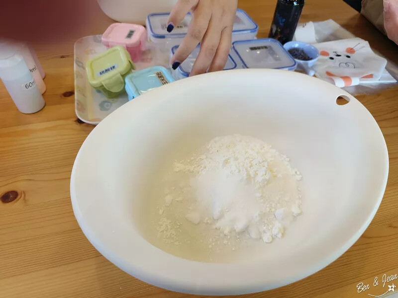 帶著手套,好像和麵粉一樣,將它攪一攪,加入喜歡的精油,再揉捏成圓球狀就成功了