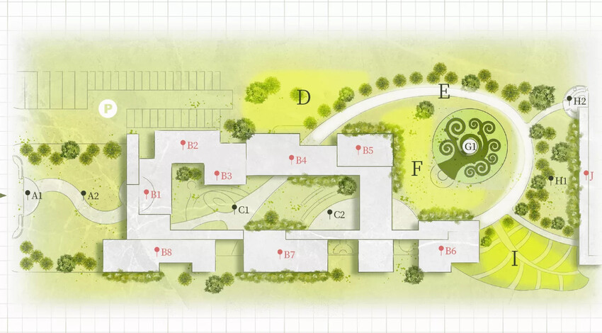 很有趣的赫蒂法莊園探索地圖。互動式的牆面,將園區的設施用有趣圖示的方式展現出來