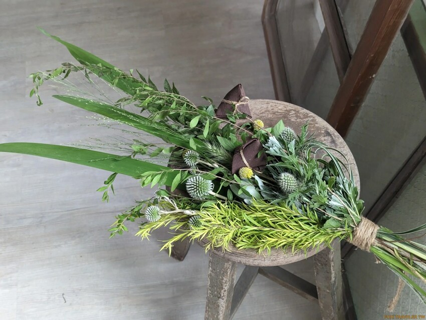 在最後的尾聲階段,綁上麻繩,讓整個花束形成一個完整的作品,也讓花束可以被掛在家裡成為裝飾。