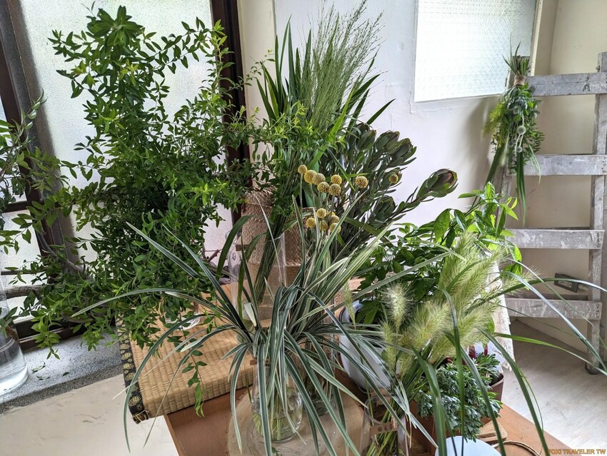 推開有點時光痕跡的木門,走進門市裡面,映入眼前的是大量的花朵,隨處可以各種插在花瓶裡的花朵,這些都是店家用來製作花藝設計或是給參加課程的學生使用的材料。