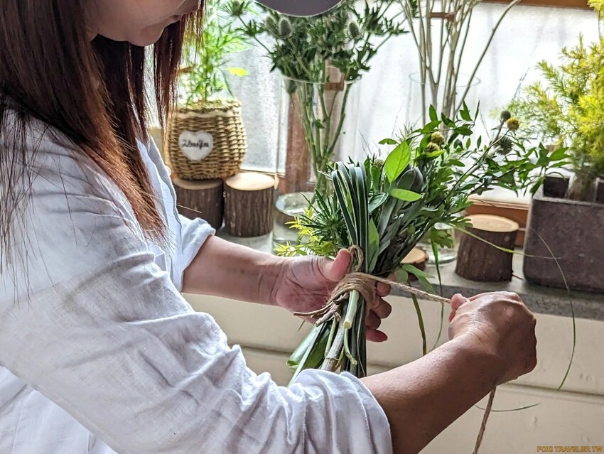 這次配合端午的節慶,店家也有特別準備粽子造型的小裝飾,掛在作品上面更加的應景,我想避邪的植物做成這個樣子,一定每個人都爭相會在家裡掛上一束吧!