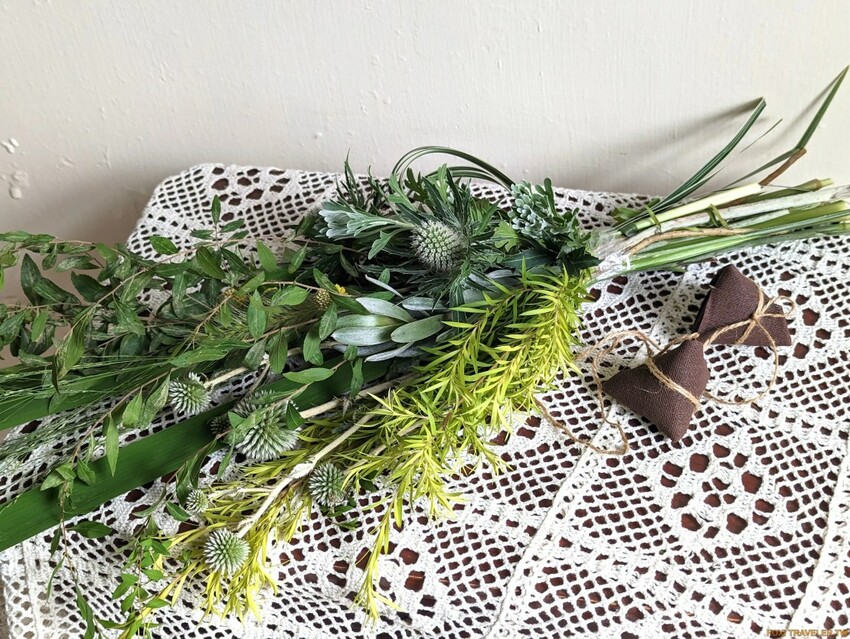 近看可以看到這是不同的花材,像是雪柳、風動草、奶油陽光非洲鬱金香等等,當然端午避邪用的艾草也在其中,這才是這次的目的,除了裝飾之外,避邪也是一大功用。