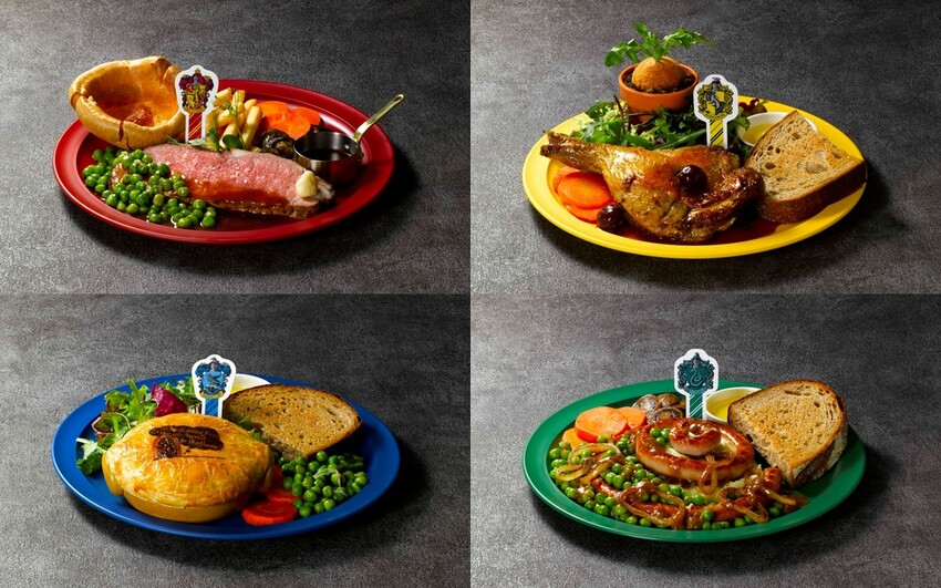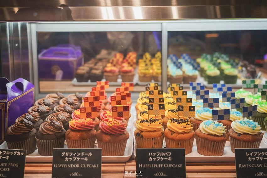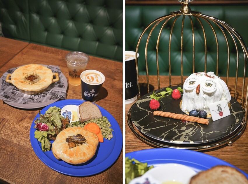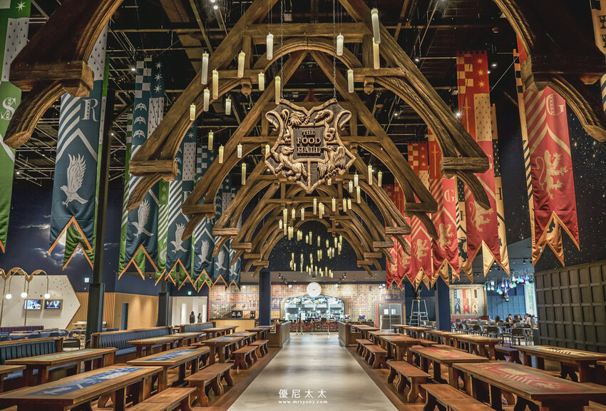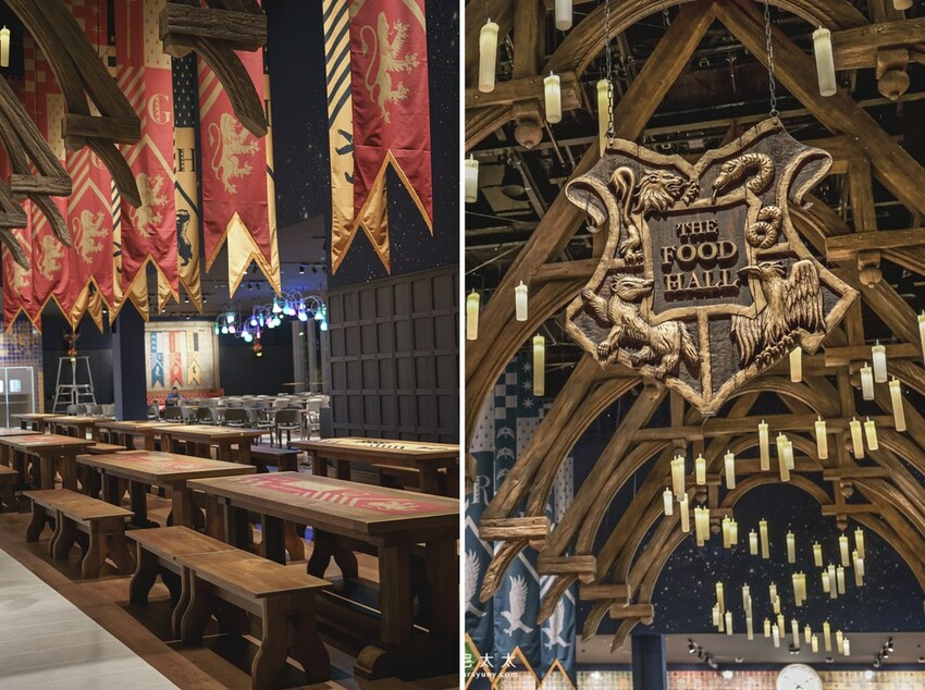 通過安檢後,迎面而來的就是展區前的廣場,而右手邊就是餐廳區域,有著巧克力蛙甜點店及提供正餐的大型餐廳,首先,餐廳部分主要提供英式早午餐,漂浮在天上的蠟燭及學院旗幟,彷彿就像踏入霍格華滋的食堂,光是坐在長椅上就覺得十分滿足;巧克力蛙甜點店更是推出四大學院的限定甜點,光是用看的就覺得超級吸睛,另外,餐廳座位區有規劃好幾個巧克力盒的座位區,若是你能搶到這個位置,拍照起來會非常漂亮喔!