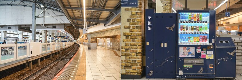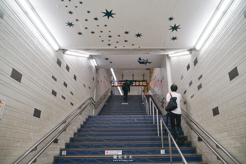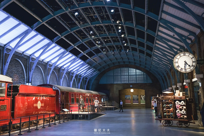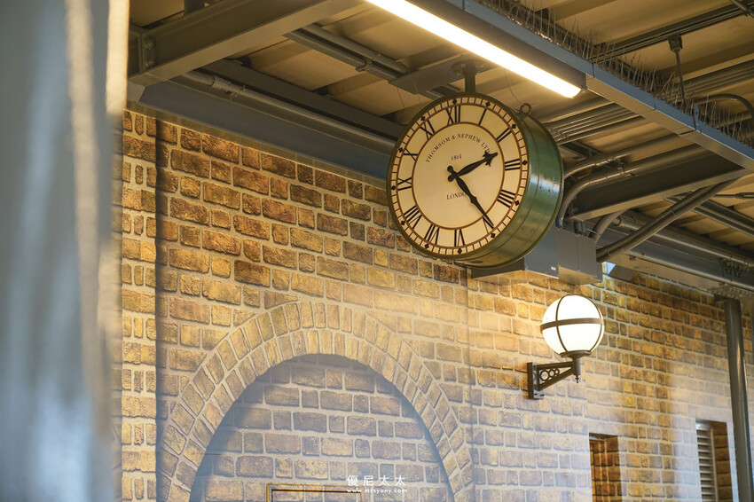 一號月台整個貼上磁磚壁紙,從二號月台拍過去,就可以抓到滿滿英倫風格的背景,車站貼心到連地下室的連結樓梯也貼上白色的魔法壁紙,其中最具特色的莫過於月台上的“魔法時鐘”,會不停的逆時鐘旋轉,非常適合拍短影片喔!