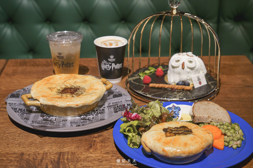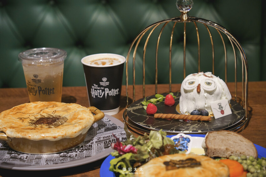 老實說,我覺得餐點表現出乎我意料,若是以樂園的水準來說,其實還蠻不錯的,派的部分為奶油魚濃湯上面鋪上一層酥脆的派皮,雖然份量有點稍嫌不足,但是套餐還有含一杯飲料,其實還不錯。另外,「嘿美蛋糕」是最欠買的造型蛋糕,盛裝在一只金色的鳥籠蛋糕盤中,雪白的蛋糕,填入了草莓、香蕉及卡士達醬,以及信封造型的餅乾一片。服務生會提著鳥籠上菜,就像哈利提著嘿美的籠子一樣,讓所有哈利波特迷見到為之瘋狂的一款甜點。