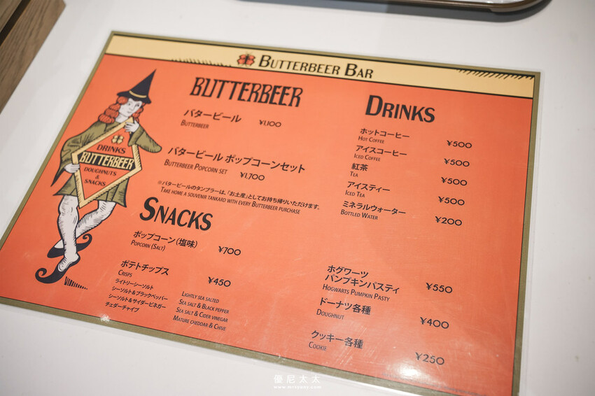每每到了活米村,看哈利榮恩及妙麗喝著『奶油啤酒』,那個一飲而下的畫面真的讓人好想喝,在東京影城中,這個仿奶油酥餅和奶油糖的風味創作的一款“無”酒精飲品,小朋友也可以喝喔!這個小酒吧就位在戶外展區中的一隅,雖然實際品嚐後真的非~常~甜,但是劇中經典飲品,怎麼可以不喝呢!另外,承裝奶油啤酒的杯子為塑膠杯,喝完後,可以到一旁清洗後帶回家作為紀念品