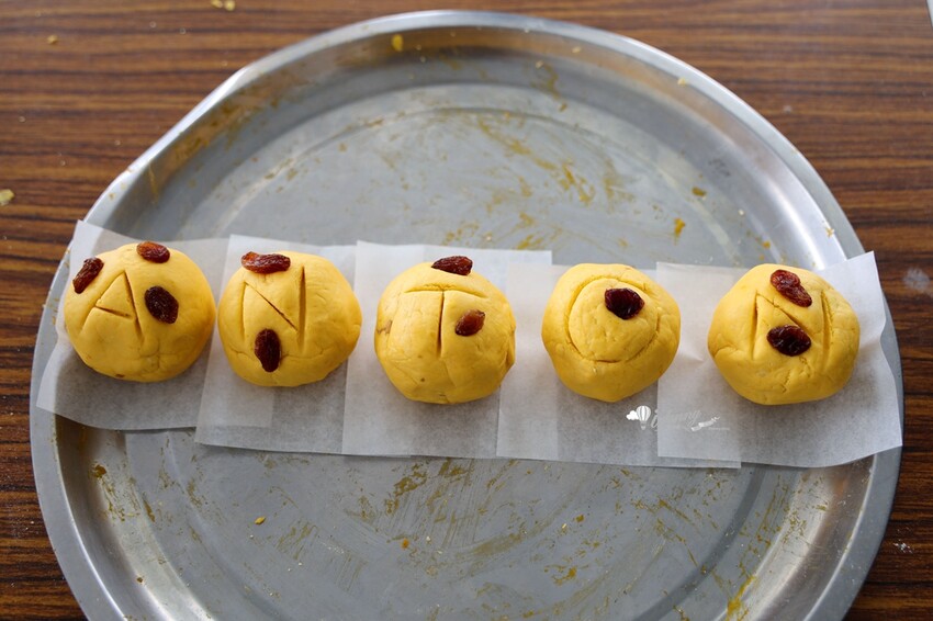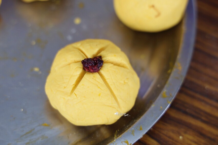 包好的金瓜糕,用牙籤劃出仿南瓜的紋路,再放上一顆果乾當蒂頭,這樣就完成囉!