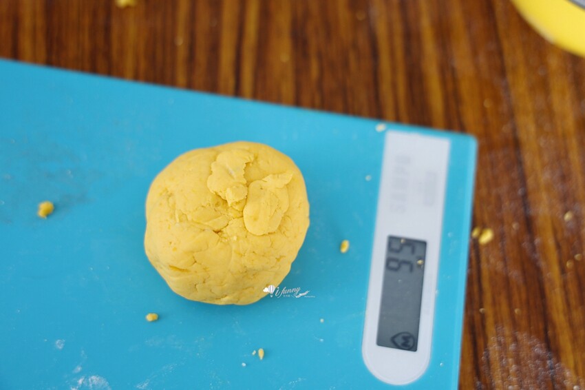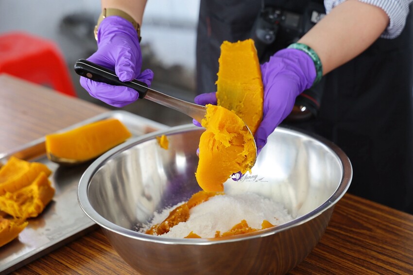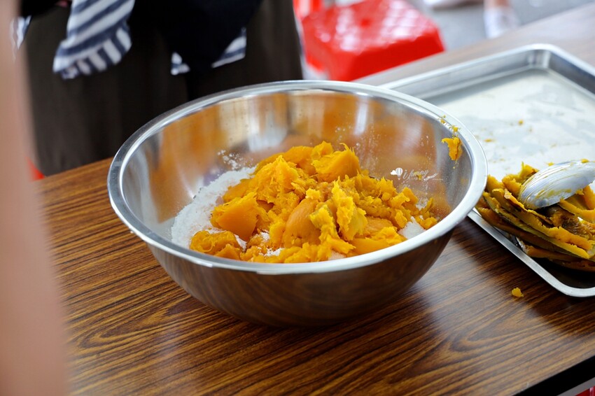 加入定量的糥米粉、糖後,就可以把南瓜一起拌入。