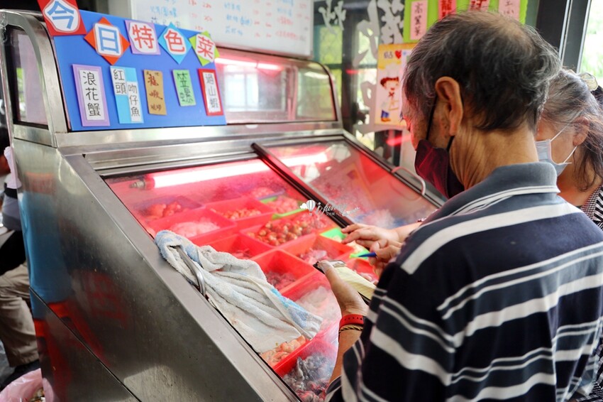 的門口有個海鮮冷藏櫃,展示著的都是當天早上捕獲的南澳海鮮,直接擺在現場讓客人挑選。做法是要清蒸、拌炒、煮湯等,都可以跟老闆討論喔!