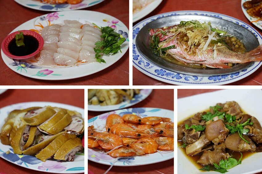 這天我們一桌是八菜一湯,從綜合冷盤、土魠魚生魚片、白灼蝦、甘蔗雞、紅燒豬腳、清炒大白菜、破布丁蒸魚、鼓蚵豆腐到土魠魚骨味噌湯,大家吃得超滿足!