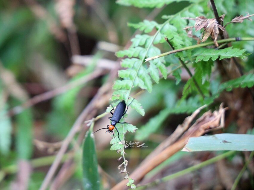 這個有鮮豔紅色頭部的昆蟲,是豆苑菁,喜歡群聚在蕨類葉面覓食。