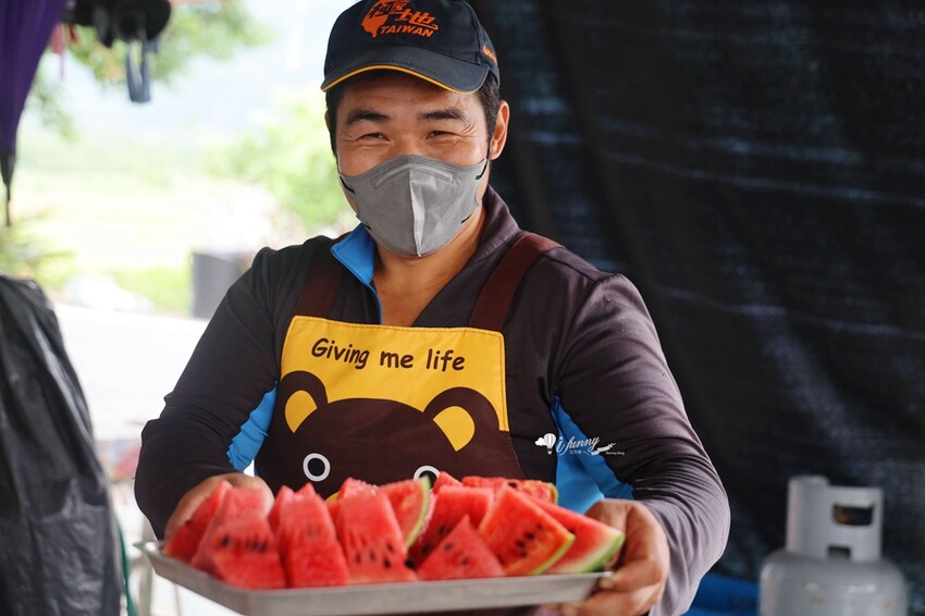 我們才一下車,標哥就拿了他們自家栽種的西瓜,而且已切好一片片,給我們吃!冰涼清甜的西瓜,炎熱的天氣吃來,實在太爽快了!